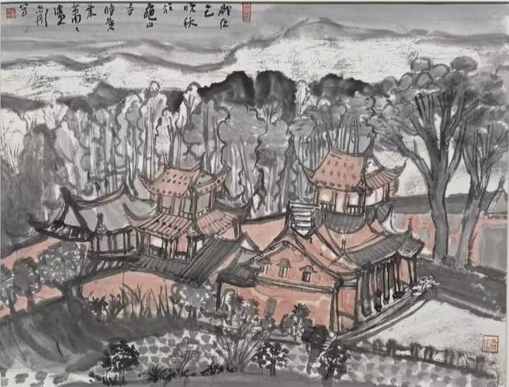 《红檐古寺图》 45 x 35 cm