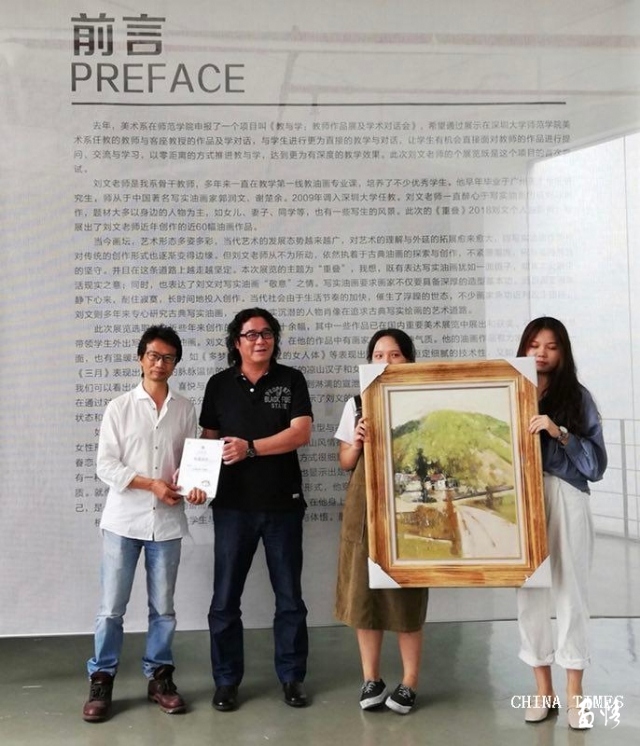 刘文(左)赠作品给深圳大学美术馆收藏,陈向兵(左二)代表深圳大学美术馆颁收藏证书给刘文。