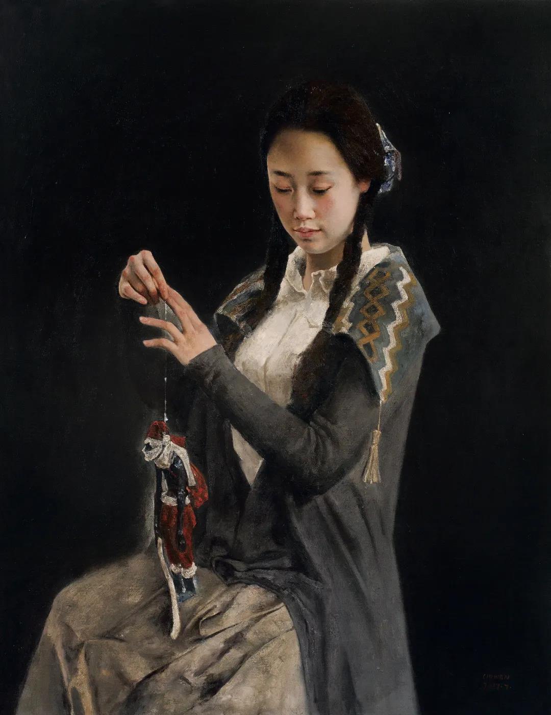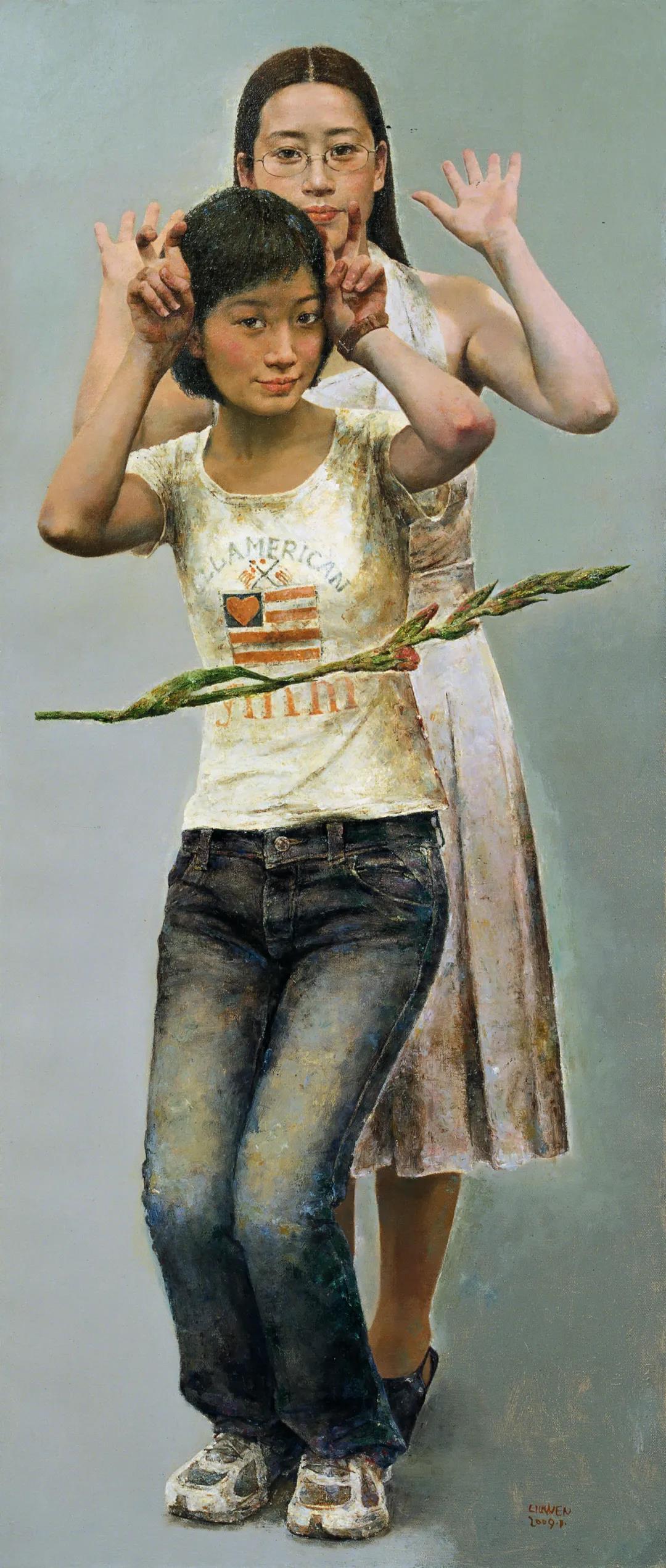 《雨夏》的人物原型是我的妻子和女儿,她们有时像闹山的麻雀,唧唧喳喳欢快嬉闹,脸上“开岀”灿烂的“花朵”,有时莫名地感伤流泪。女性的这种心理和情绪犹如夏日的天空,时而阳光明媚,时而阴云密布,为表现女性这种变化无常的心理和情绪,我选择夏日骤雨将至时这个极富情趣的瞬间作为依托,既与画面氛围和情调相合,又暗示人物的心理状态。作为“宇宙之精华、万物之灵长”的人,有着千姿百态的变化和丰富的表情,反映出其体型、外貌、生活经历、内心世界等,在某种意义上也折射出时代生活的特质。