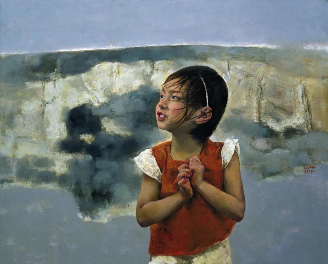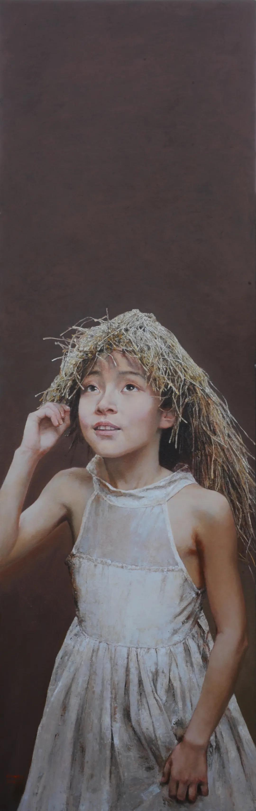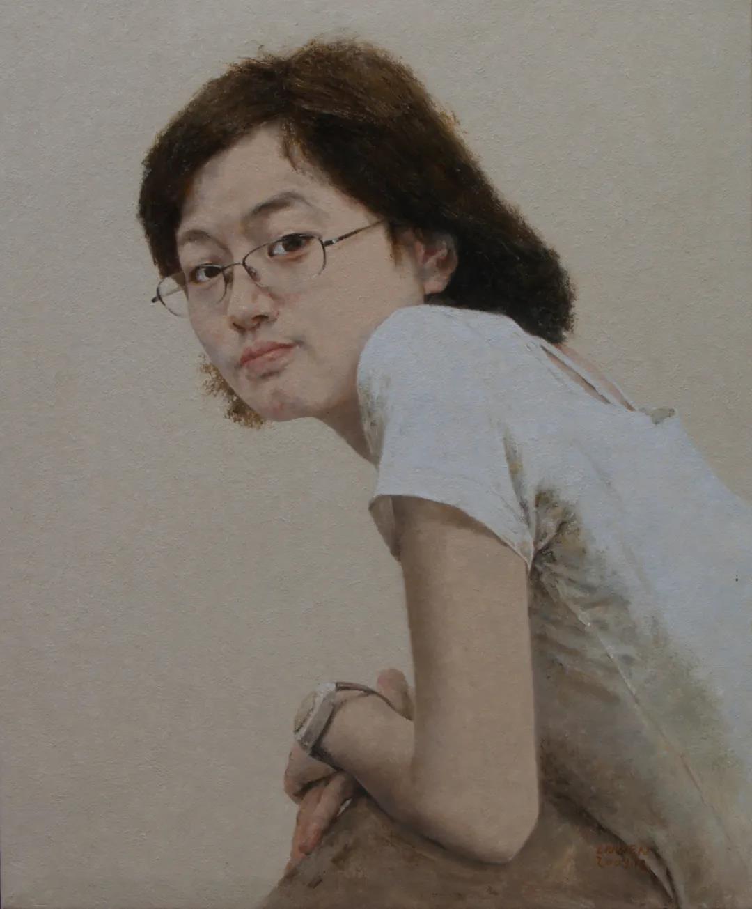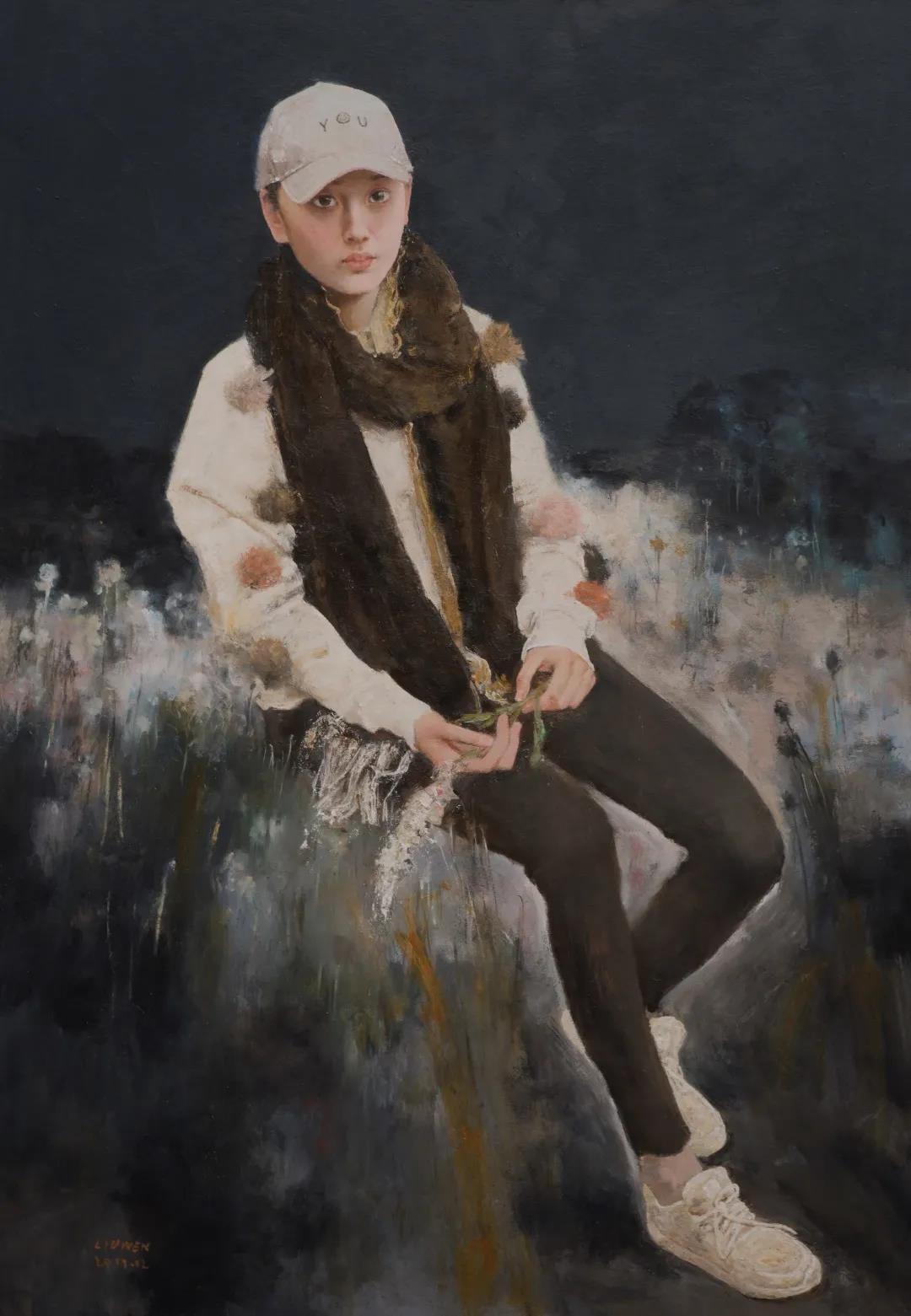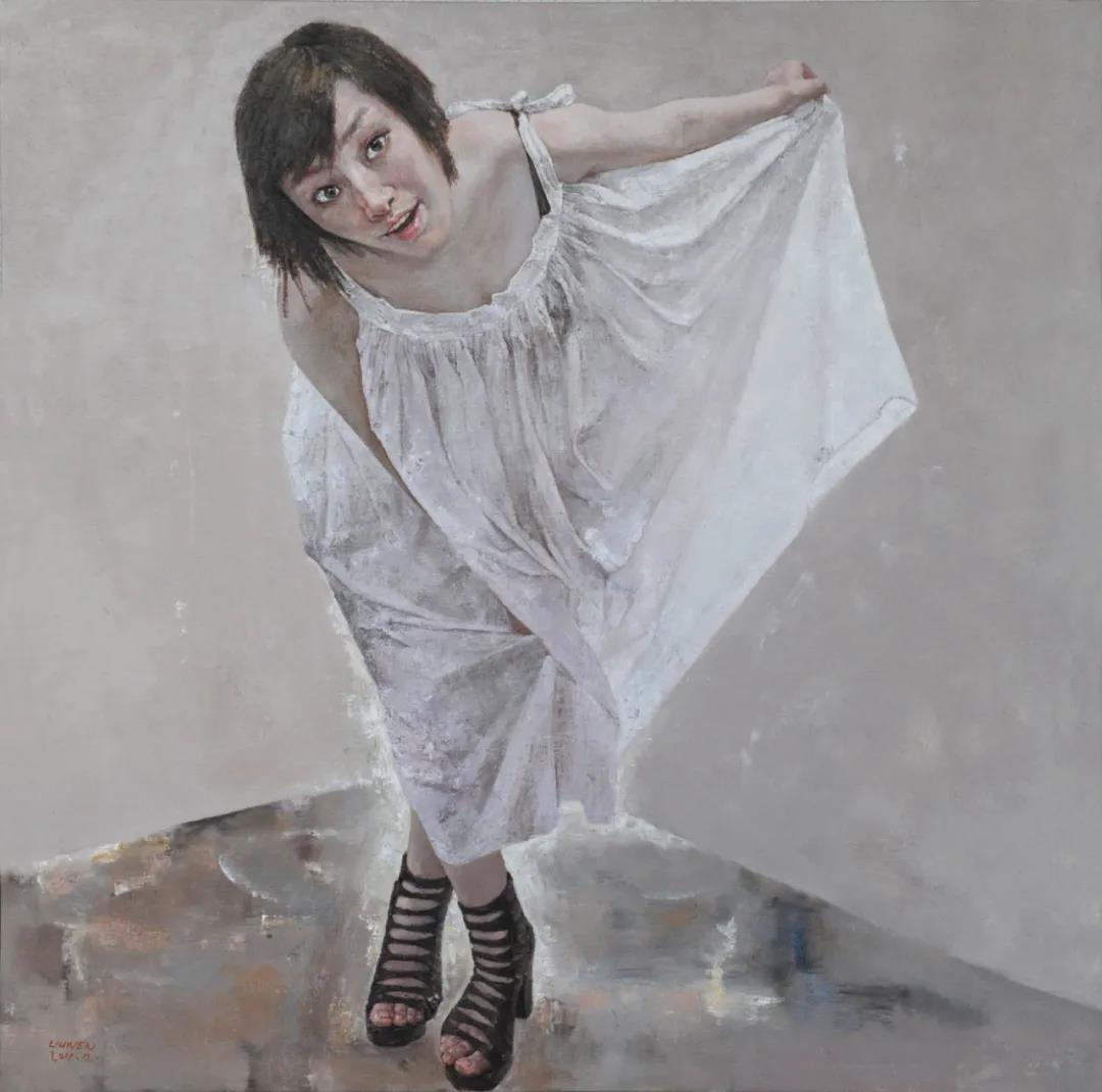 《仲夏之梦》中女孩的形象来源于即将毕业的艺术系的大学生,她是我的学生,热爱艺术,又对艺术、对人生的前途既憧憬又迷茫,因此,画面中女孩平视的目光透射着对艺术基徒般的虔诚、对生活的憧憬、对未来的向往,整体亮灰色调衬托出窗下逆光中的女孩,多折皱的白色裙子与背景浑然一体,素淡典雅,物象形体轮廓的处理既有实线又有模糊不定的虚线,使物象既有形又与其它物象容为一体,虚实相融,厚厚的色层、色块、斑点呈现出浮雕感。整个画面有意与偶然的色层肌理,整体的具象与局部的抽象统一,达到难以分辨是刻意为之的描绘还是偶然的肌理的效果。