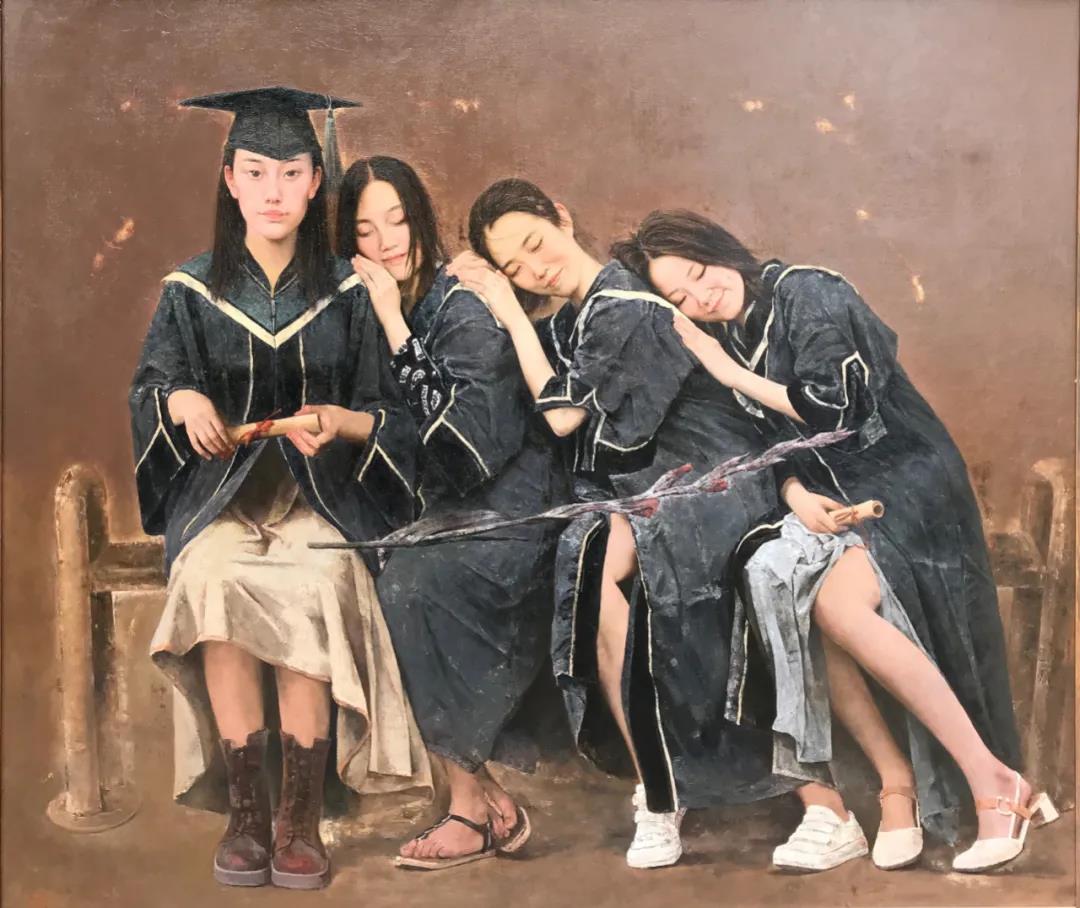 《畅想青春》,描绘即将毕业的四位女大学生,她们青春、阳光、朝气蓬勃,畅想着即将升学或踏上工作岗位的幸福时光。画面采用写实的人物与平面的背景结合,使古典写实绘画三度空间减弱而趋于半平面化,线条的虚实处理注重动与静的韵律,细节刻画注重典雅精致。画作既注重现实人生与时代精神的观照,又注重艺术形式的表达,以增强视觉的张力。