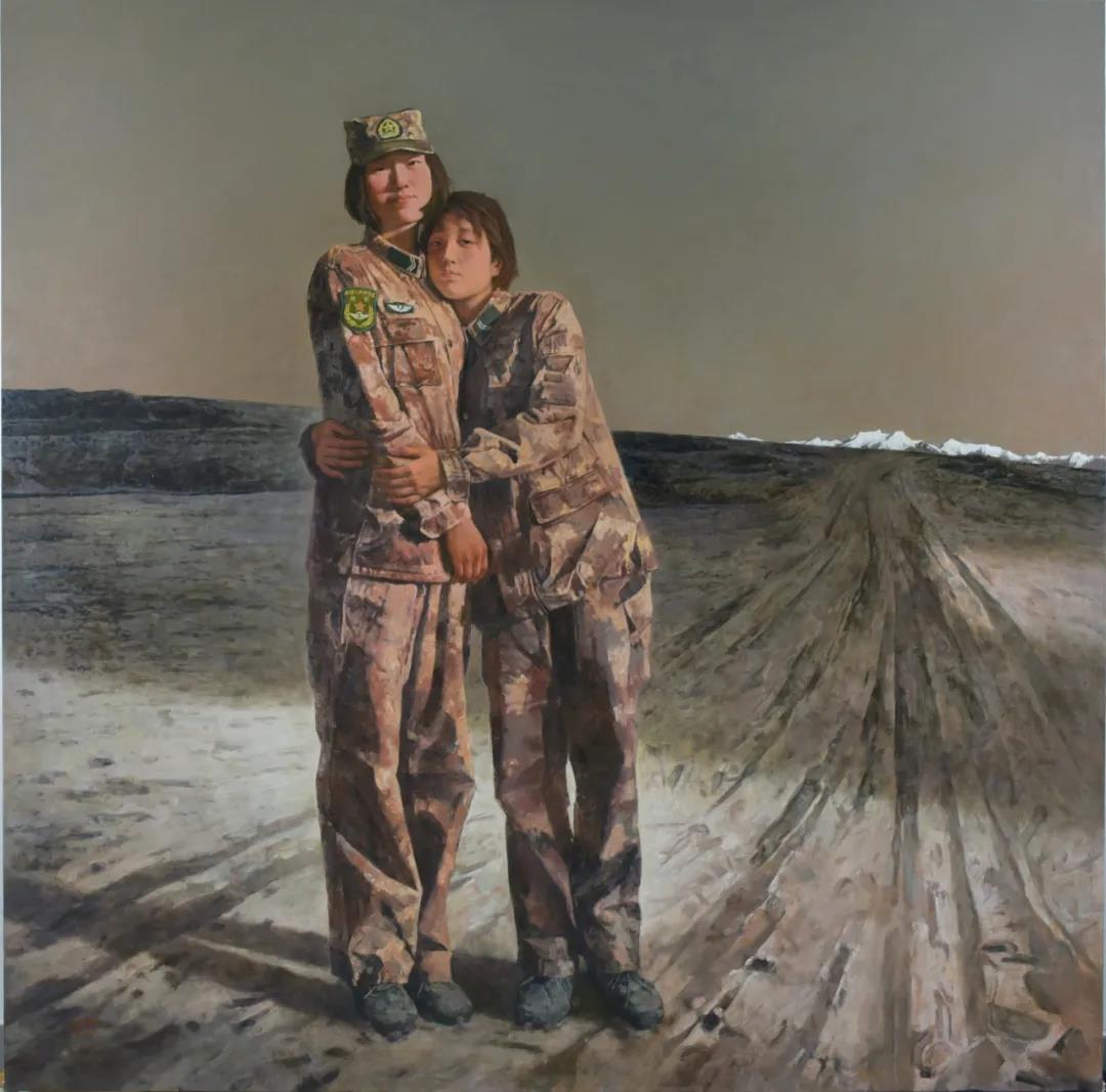 她在西藏部队生活的点滴记录以及她们的精神境界,是我创作《送别》的契机,创作这幅画的初衷是想画出“有灵魂、有血性、有温度的新时代革命军人”形象,表现战士们平凡艰苦的生活,真诚纯洁的战友情谊以及新时代青年战士青春、阳光、吃苦耐劳、强军兴军的崇高精神世界。画面构造了两位女战士在高原阳光下送别的场景,女战士脸部轮廓清晰,两眼正视前方,她们在画面中心位置,表情坚毅,俊美的形象中体现出中国军人的朝气与精神。构图采用丰碑式,体现雕塑一般的军人形象,色调为暖灰色,人物在深灰色背景的侧光中,体现高原的阳光。深浅的色层、局部与整体的构成,让画面的空间与气氛感觉出真实的环境。整幅画面力求在特定的时空场景中展示人物形象,挖掘与刻画战士们有灵魂、有血性、有温度的形象特征与精神风采,反映时代要求,在生活真实与艺术真实中达到艺术的感染力。