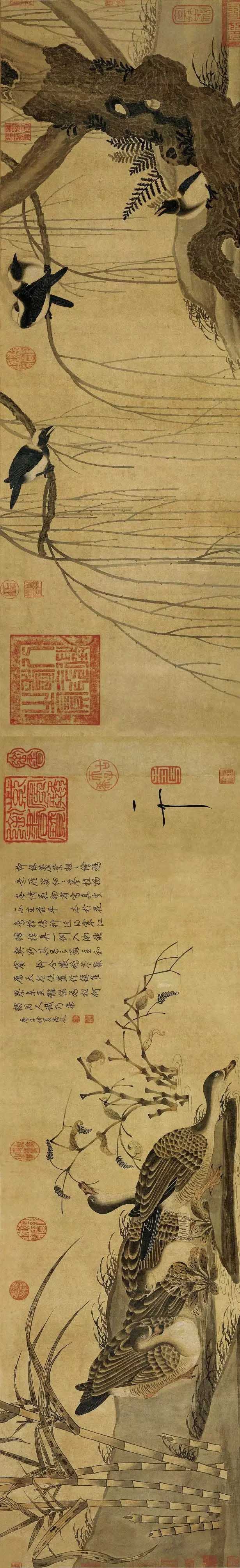 此图分前后两段,前段绘有四只栖息于柳树树根、枝头的白头鸦;后段绘有四只在芦苇旁临水而饮的大雁,鸦、雁神态各异,充满盎然生趣。此图生动体现了宋徽宗花鸟画的拙朴风格,设色以水墨为主,略施淡彩,墨色浓淡有致、富于变化,用笔圆润流畅,整体寓巧于拙,朴素而不失典雅。与该画题跋所说“笔法浑然天成,脱去凡格,浓淡运墨,约略如生。幽静清绝,不可模状。得江南落墨之余韵”十分相符。此图署款“天下一人”,是为赵佶的花押。画上钤有“宣和中秘”、“御书”等印。