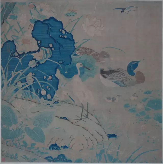 此图幅式较大,色彩丰富,丝缕匀称,缂丝紧密织细,层次分明,是朱克柔缂丝中的杰作。此图为黄色熟丝地,彩色纬织莲塘乳鸭图。图中双鸭浮游于荷梗萍草间,尾有乳鸭相随,翠鸟、蜻蜓点缀其间。坡岸用石青,质感凝重。旁有白鹭、白蕖、慈菇、花草,色彩雅丽,线条精谨,具有莲塘的自然生趣,俨然院体风格。石缝间织“江东朱刚制莲塘乳鸭图”款,“克柔”朱文印记。经近人庞元济收藏,钤“吴兴庞氏珍藏”、“虚斋秘玩”、“莱臣審藏真迹”印记。庞元济《虚斋名画录》、朱启钤《丝绣笔记》著录。