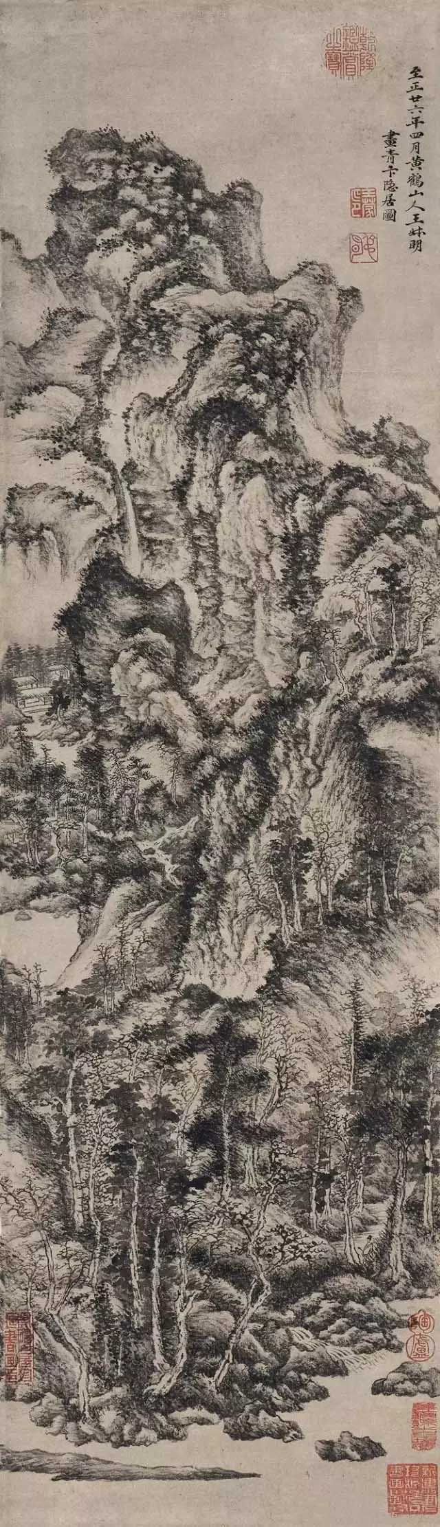 此图右上方有王蒙自题“至正廿六年四月,黄鹤山人王叔明画青卞隐居图”,是其晚年风格成熟之作,是王蒙最富盛名的代表作品。明代书画家董其昌在此图上题写有“天下第一王叔明”。