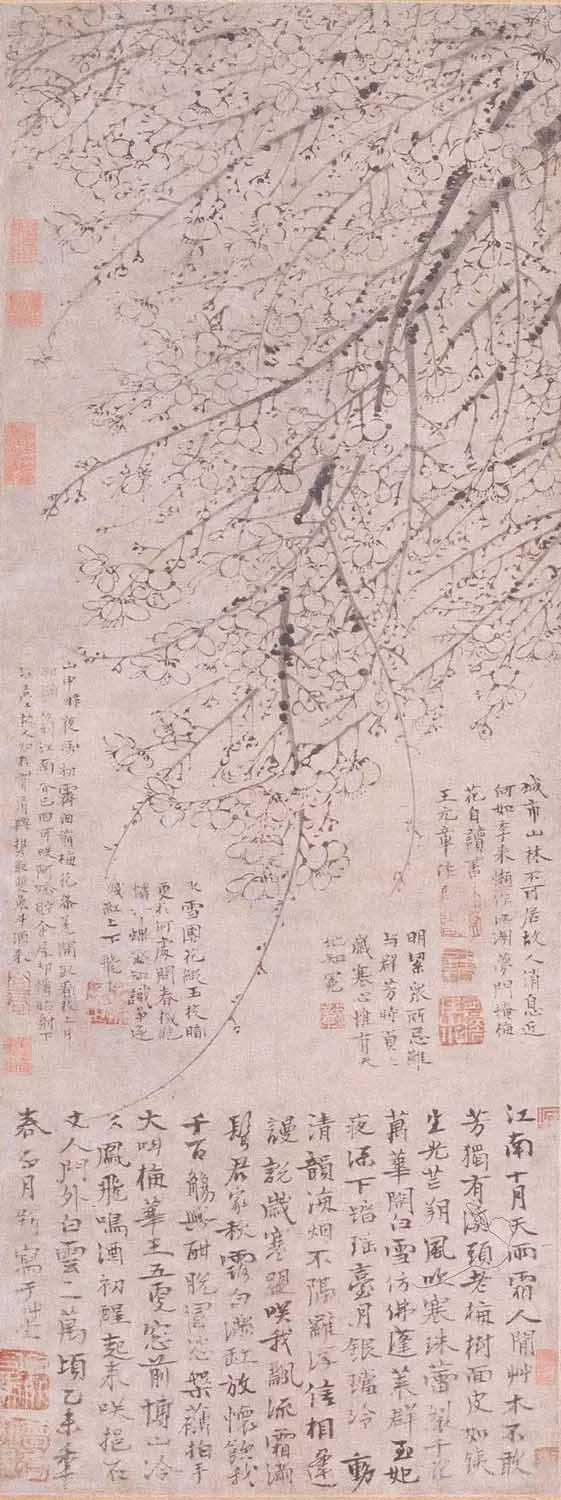 此图描绘一簇倒挂的梅枝,画面中梅枝生长繁茂,伸展交错;梅花缀满枝头,千姿百态,或含苞待放、或怒放盛开。王冕以水墨挥写,画以繁植万花,梅花的分布在浓密交错中而富于节奏韵律,乱中有序,杂而不乱。干枝与白洁的梅花相映成趣,更加突显出梅花的高洁清气。此图共题诗五首,直抒胸臆,诗、书、画相结合,将王冕本人的画品、诗品和人品融为一体。此画有署款“乙未年春正月朔写于草堂”,是王冕晚年之作,其画梅艺术已臻于佳境,为历代文人所珍视,画上有明代祝允明、文徵明、唐寅等多人的题诗,使此图更添价值。