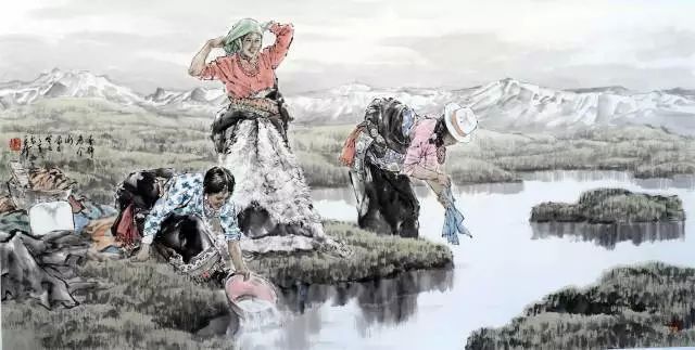 苗再新对于少数民族题材有种特别的钟爱。客观上,这种题材适合笔墨表现,无论是发型、服饰还是体态、环境,无不为笔法墨韵提供着发挥空间。身穿藏袍的高原儿女显然比西装革履的都市白领更利于笔墨意趣的发挥。主观上,苗再新多年来致力于人物造型与笔墨色彩之融合,既求造型准确,又求笔墨生动、色彩丰富,选择少数民族题材有助于攻克这一难题。经过多年积累和摸索,苗再新掌握了一套表现少数民族人物的笔墨技法,不断创作出大量精品力作。例如,他于2011年完成的大型组画《民族之光》由56幅1.72米宽、长2.32米的画作连接起来,描绘了56个民族丰富多彩的生活场景,构成了一部长达百米、气势恢宏的民族风情画卷,更是一首盛世中国民族和谐的时代颂歌。