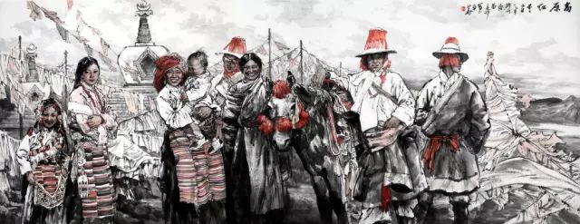 人物画创作特别忌讳造型概念,千人一面,因此苗再新要求自己画面中的每一个主要人物都要有原型,这样人物形象才能各具特色、生动感人。如《雪域子民》这幅作品,场面恢宏,人物众多,神态各异,从天真稚气的少年到饱经风霜的老者,个个惟妙惟肖,形神兼备。画面中多达百余藏民,都有生活原型,绝无重复,但经过画家的高度概括、提炼和深入刻画,又传达出一种凝然浑厚的意象表达。这组群像所构建起的分明就是一座青藏高原,巍峨耸立,血脉喷张,史诗般传达着一种神圣不朽的藏文化精神。