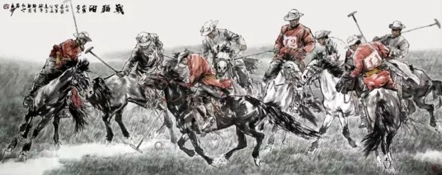 苗再新军事题材的《热血男儿》、《儿女英雄》、《会师井冈》、《生死挺进》等一系列作品体现了史诗般的英雄气概和历史时空的沧桑感,包含着恢弘深刻的意蕴,带给人们一种精神上的震撼与感动!如《热血男儿》这幅作品,既具有厚重的历史感,又富于现代的形式感,强烈的视觉冲击力和形象感染力令人印象深刻。